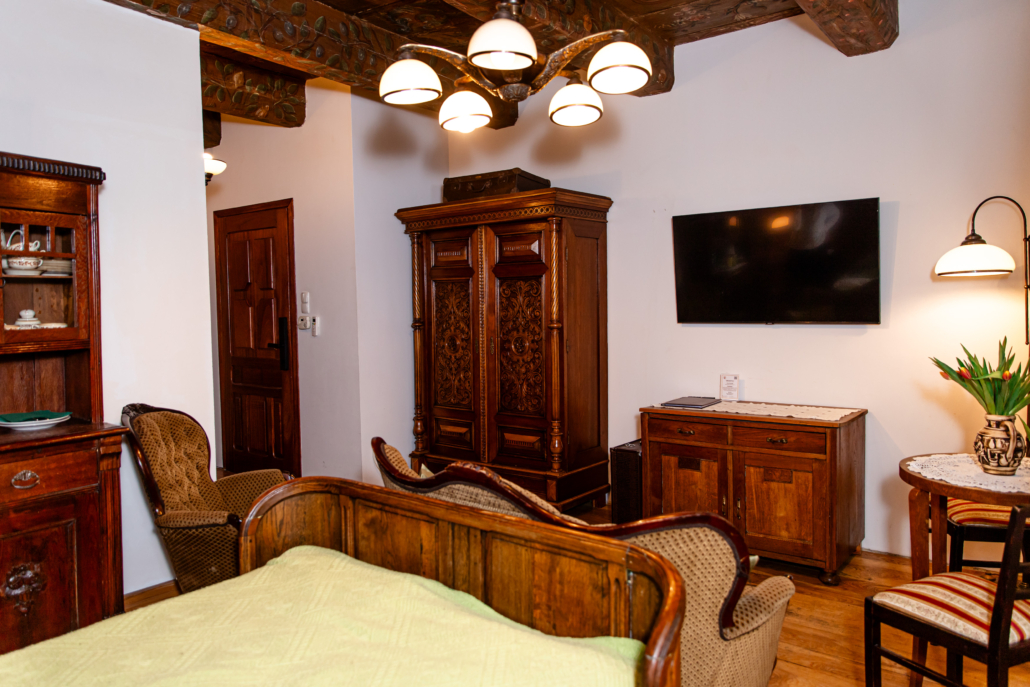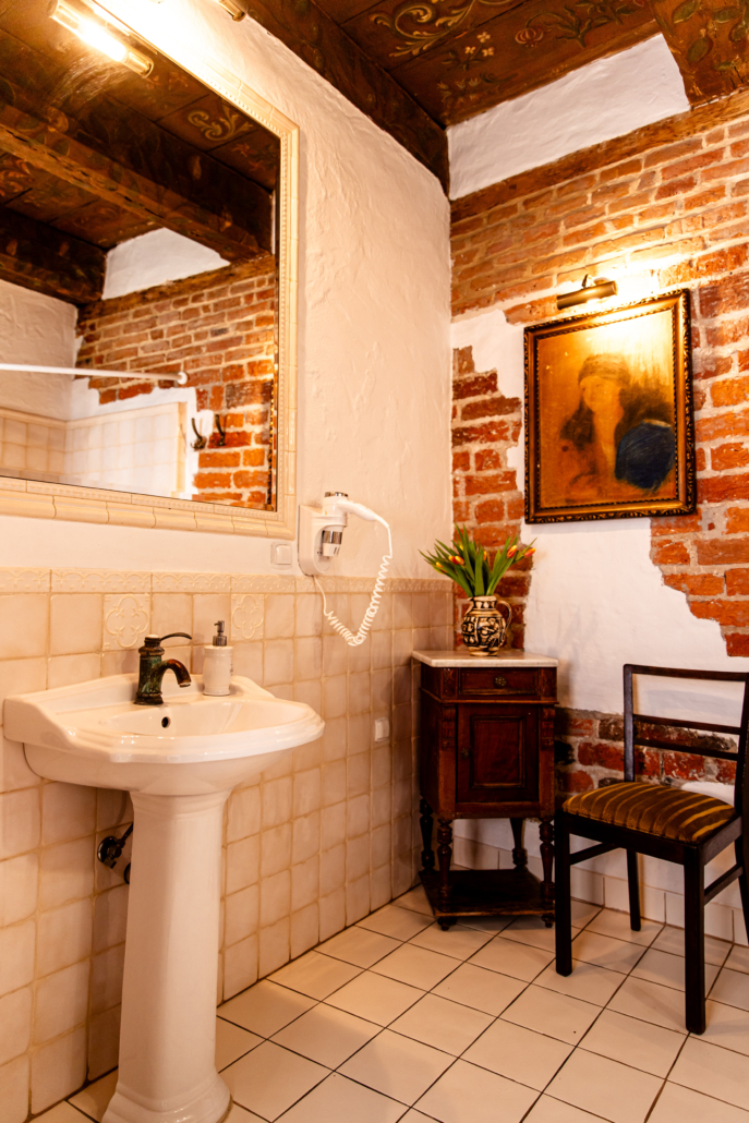 Historyczne polichromie nad głową, rzeźbione meble i widok na wewnętrzne patio tworzą atmosferę, w której czas zwalnia, a codzienność nabiera elegancji. Idealny wybór dla osób, które pragną odpocząć w otoczeniu sztuki i toruńskiej tradycji, w ciszy, którą od rana dyskretnie dopełnia aromat kawy unoszący się z wewnętrznego patio.