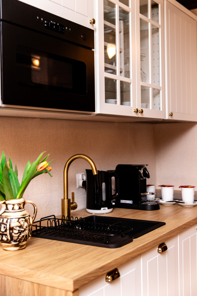 Apartament jest prawdziwą oazą ciszy i spokoju w samym centrum miasta. Z okien roztacza się widok na urokliwe podwórza starych kamienic, które nadają wnętrzu klimat i poczucie prywatności, mimo bliskości toruńskich zabytków, restauracji i kawiarni. To miejsce, w którym elegancja spotyka się z ciszą – stylowe meble, złote detale i widok na historyczną zabudowę tworzą atmosferę wyciszenia i intymności. Idealne dla osób pragnących odpocząć w stylowym wnętrzu z duszą, z dala od zgiełku, lecz w samym sercu miasta.